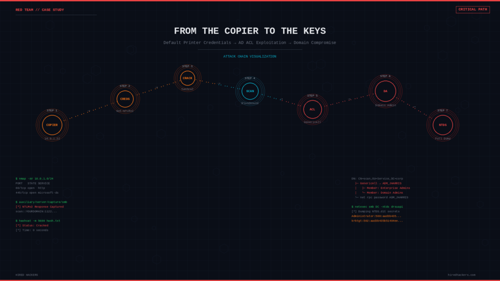 A networked copier with default admin credentials. A stored domain account. Six hops through Active Directory ACL misconfigurations. Complete domain compromise - no CVE required.